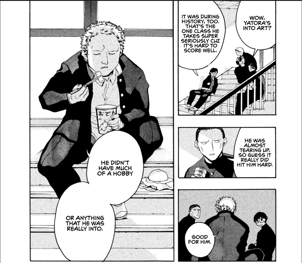 Vou começar pelo que eu mais gostei, que é a óbvia diferença de habilidades entre nosso protagonista e o Yotasuke, um colega do curso. Ele é introduzido como um gênio que é bom até para os padrões do curso. Isso coloca ele meio que numa posição de rival, mas não exatamente aquele rival clássico de anime, onde o protagonista e o rival declaram suas intenções de derrotar um ao outro. Se eu tivesse que definir melhor, Yotasuke apenas faz com que o Yaguchi note o quão atrás ele está em termos de habilidade artística.